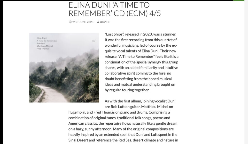 “Und so geht die Reise weiter für Elina Duni. Auf bekannten und unbekannten Wegen. Das schöne daran ist auch, dass sie dabei immer wieder die Stille durchbricht und uns mit vertonten Trouvaillen von ihren Erlebnissen berichtet” Rudolf Amstutz, Jazz’n’more